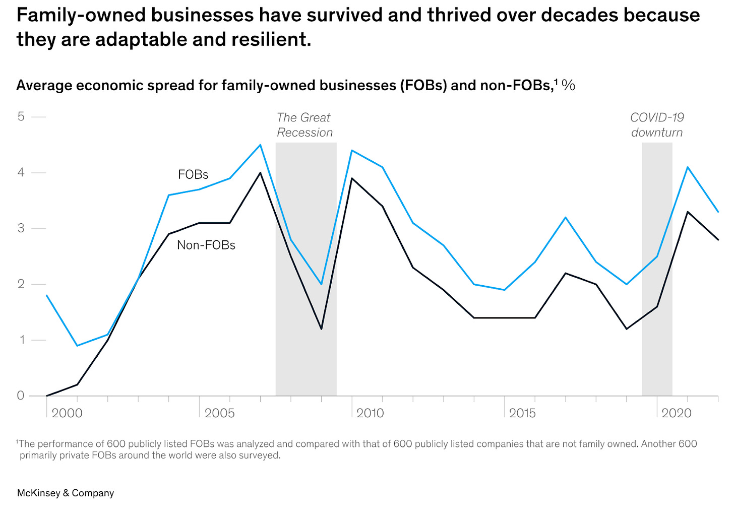 In a large-scale 2023 report, McKinsey & Co. laid out decades of business performance data showing that Family Owned Businesses (FOBs) consistently weather market downturns and stick around longer than others.