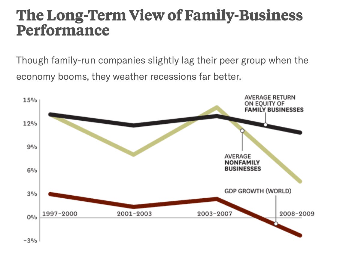 Harvard Business Review reports that family businesses may not grow as quickly during boom times, but they tend to be more stable during hard times for this very reason.